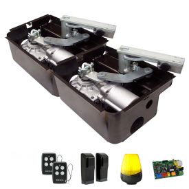 Kit-ul contine: 2 motoare 230V ingropate cu carcase de instalare, 1 unitate de comanda cu receptor incorporat, 1 antena, 1 lampa de semnalizare, 2 telecomenzi, 1 pereche de fotocelule.