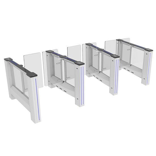 - Aripile electromecanice motorizate sunt închise în stand-by. Persoana solicită autorizare de la dispozitivul de control acces (dispozitiv terță parte) conectat la sistemul de intrare al porții. După autorizare, aripile se deschid, trecerea persoanei este monitorizată de multi-senzori de-a lungul pasajului, iar aripile se închid la finalizarea trecerii. În cazul unor autorizații de acces ulterioare, aripile rămân deschise până când ultima persoană își finalizează trecerea și apoi se închid.