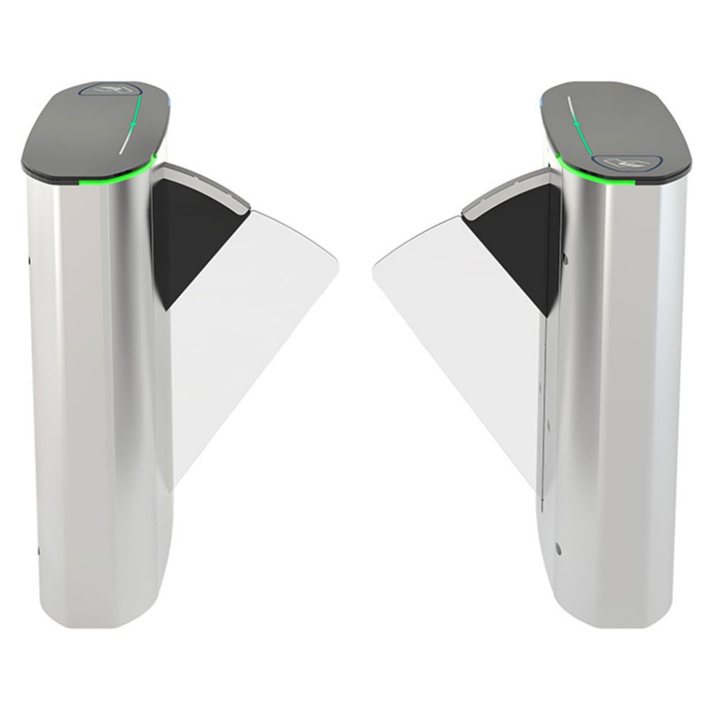- Aripile electromecanice motorizate sunt închise în stand-by (opt. deschise). Persoana solicită autorizare de la dispozitivul de control acces (dispozitiv terță parte) conectat la sistemul de intrare al porții. După autorizare, aripile se deschid, trecerea persoanei este monitorizată de multisenzori de-a lungul pasajului și aripile se închid la finalizarea trecerii. În cazul unor autorizații de acces ulterioare, aripile rămân deschise până când ultima persoană își finalizează trecerea și apoi se închid.