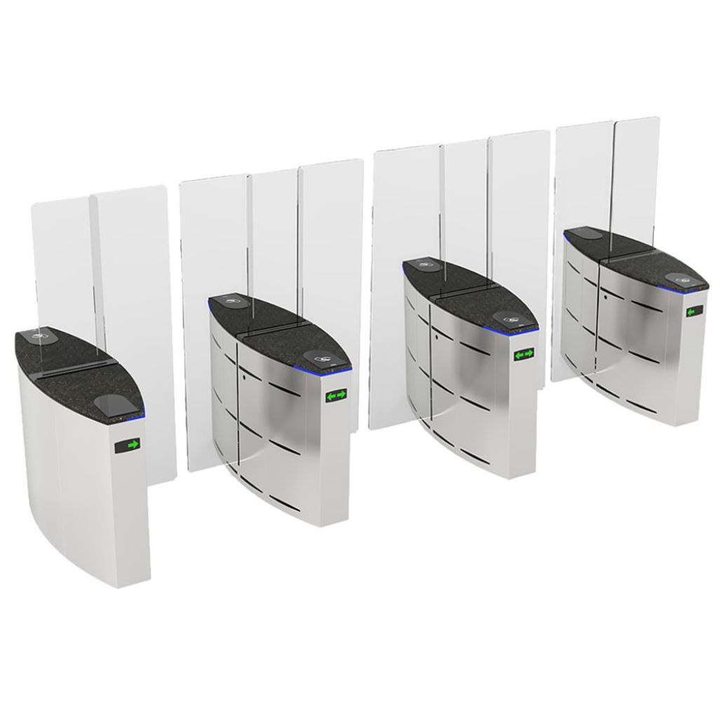 - Aripile electromecanice motorizate sunt închise în stand-by (opt. deschise). Persoana solicită autorizare de la dispozitivul de control acces (dispozitiv terță parte) conectat la sistemul de intrare al porții. După autorizare, aripile se deschid, trecerea persoanei este monitorizată de multisenzori de-a lungul pasajului și aripile se închid la finalizarea trecerii. În cazul unor autorizații de acces ulterioare, aripile rămân deschise până când ultima persoană își finalizează trecerea și apoi se închid.