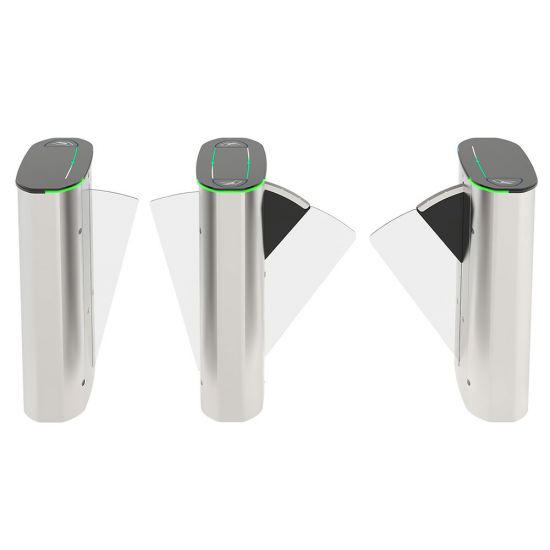 - Aripile electromecanice motorizate sunt închise în stand-by (opt. deschise). Persoana solicită autorizare de la dispozitivul de control acces (dispozitiv terță parte) conectat la sistemul de intrare al porții. După autorizare, aripile se deschid, trecerea persoanei este monitorizată de multisenzori de-a lungul pasajului și aripile se închid la finalizarea trecerii. În cazul unor autorizații de acces ulterioare, aripile rămân deschise până când ultima persoană își finalizează trecerea și apoi se închid.