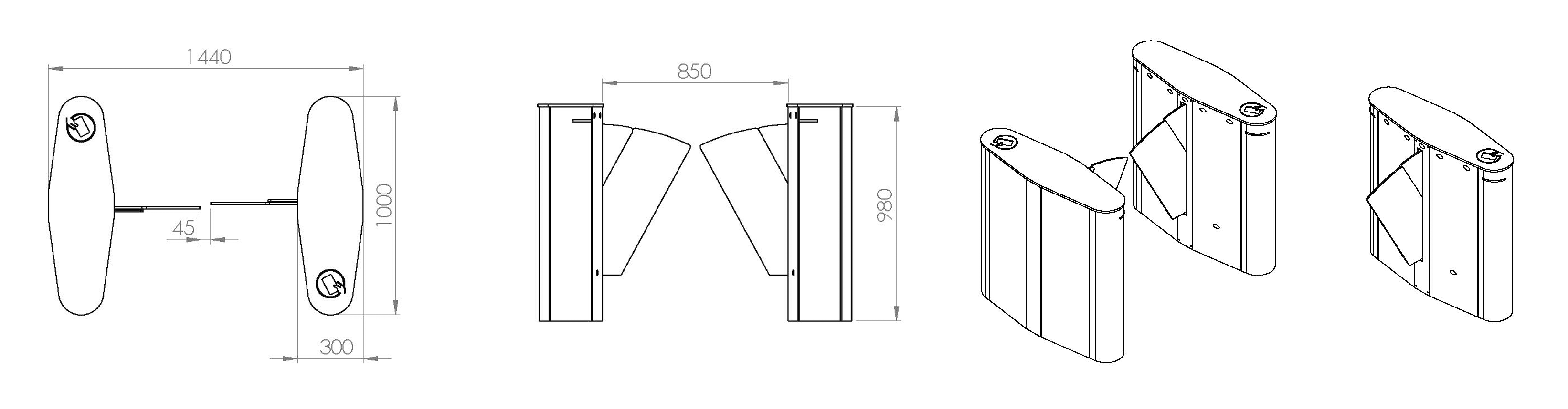 Motor de 24VDC. Acționarea mecanică se face folosind o curea și role. Controlul mecanismului se face cu 2 senzori inductivi. Aripile sunt proiectate astfel încât să nu poată fi deschise manual din exterior atunci când sunt în poziția închisă. Viteza de trecere este calculată ca fiind de 40 persoane/minut, această rată variind în funcție de sistemul de control acces utilizat.