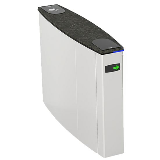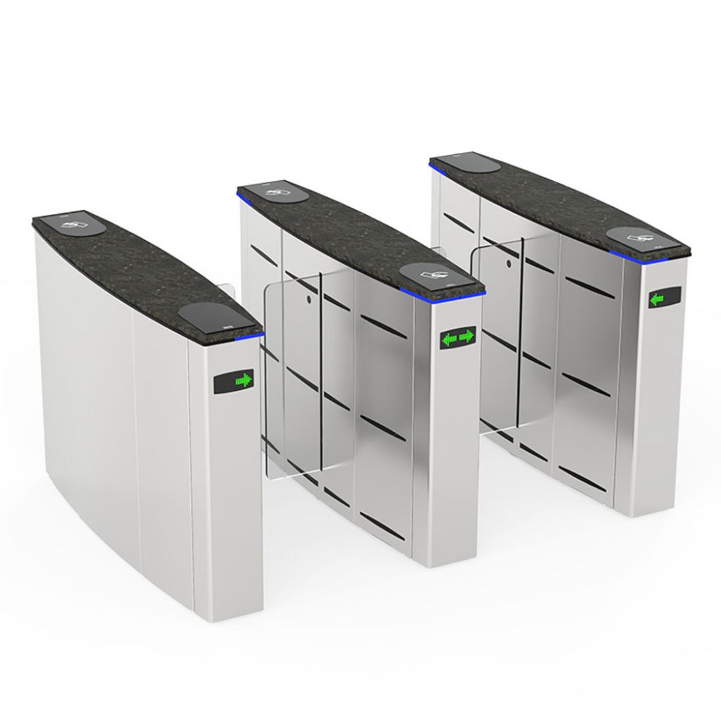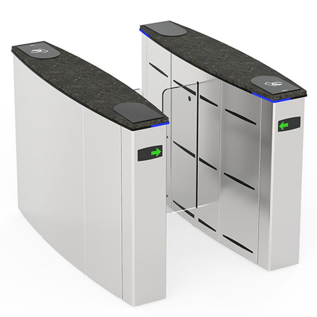 - Aripile electromecanice motorizate sunt închise în stand-by (opt. deschise). Persoana solicită autorizare de la dispozitivul de control acces (dispozitiv terță parte) conectat la sistemul de intrare al porții. După autorizare, aripile se deschid, trecerea persoanei este monitorizată de multisenzori de-a lungul pasajului și aripile se închid la finalizarea trecerii. În cazul unor autorizații de acces ulterioare, aripile rămân deschise până când ultima persoană își finalizează trecerea și apoi se închid.